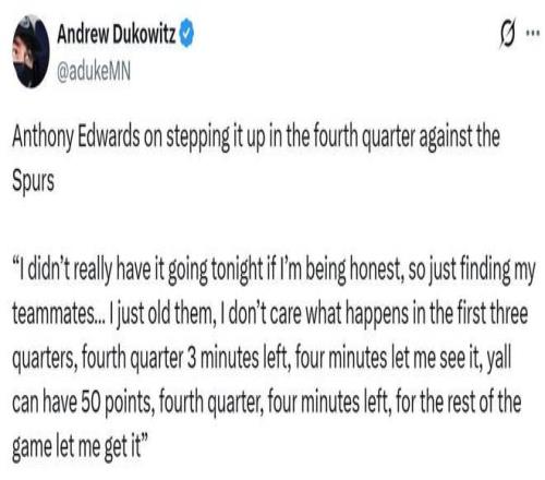 比赛结束后能够看到爱德华兹满眼不甘,同时马刺队记JeffGSpursKENS5曝出赛后爱德华兹怒爆粗口:“去TMD罚球!”以表达对于自己丢掉关键罚球的不满。